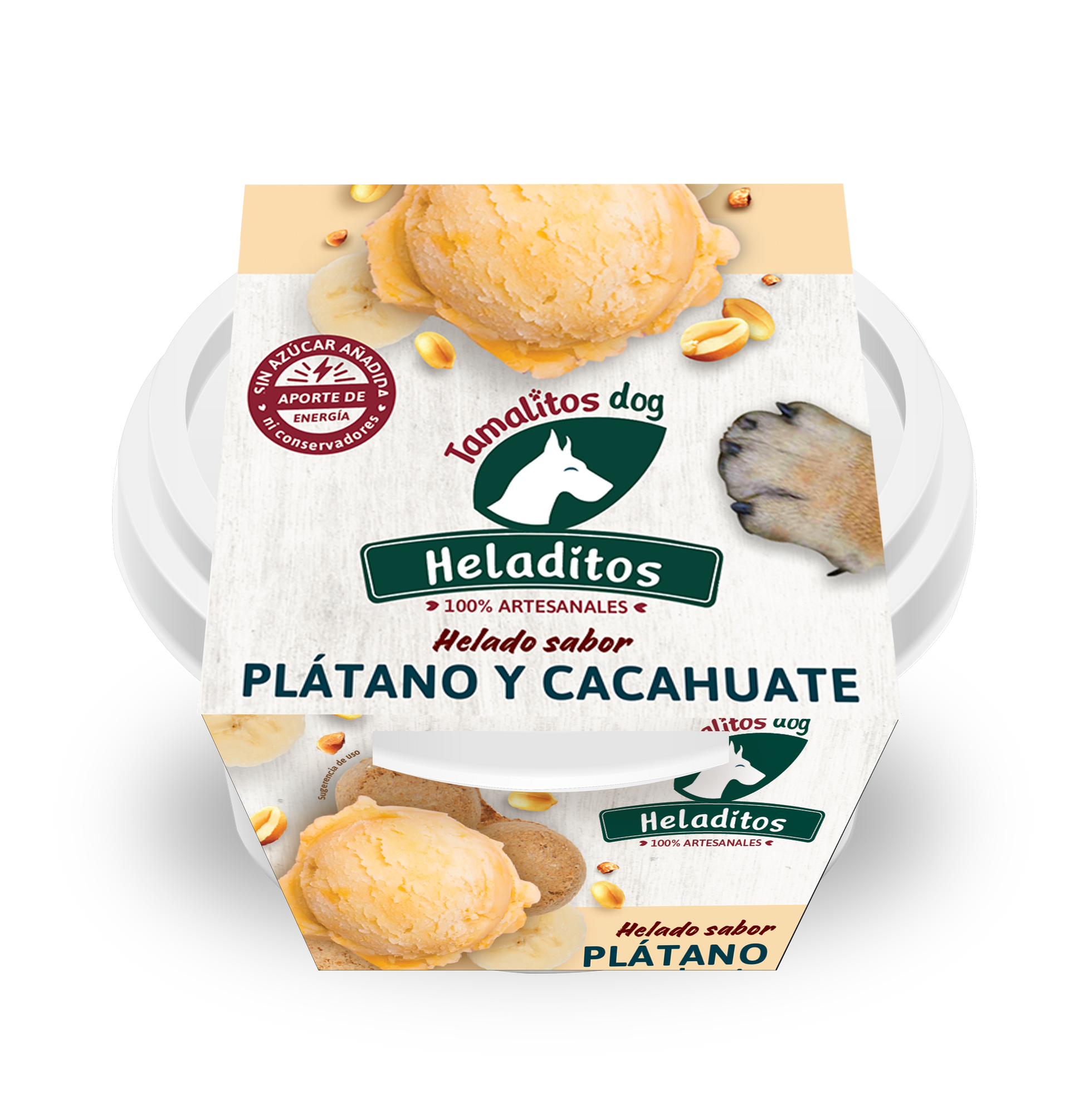 - Helado para perro 100% natural de Plátano con cacahuate, hecho con fruta fresca sin azucares añadidos, lácteos, ni conservadores.